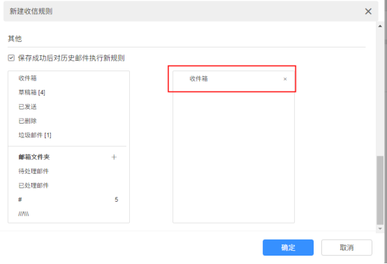 3.還可以對其他文件夾的歷史郵件執行該收信規則。選擇需要執行規則的文件夾范圍,下圖是選擇在收信箱執行該規則。歷史郵件執行規則只執行一次。